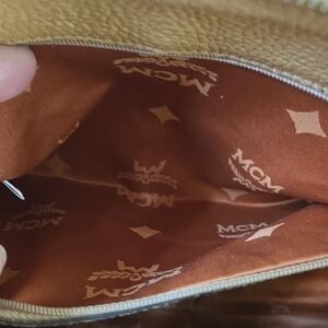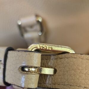 Elegant MCM satchel in tan. Features dual handles and detachable strap. Gold-tone hardware accents.