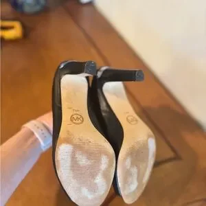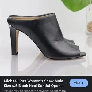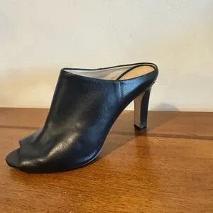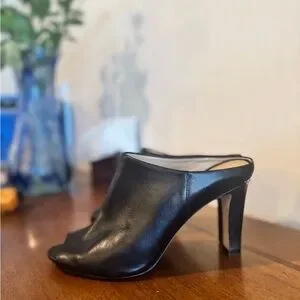 Elegant black mules with open toe. Sleek design with block heel. Perfect for any occasion. Great condition but 1/2 size too small for me. Great with a pair of jeans for this upcoming fall.