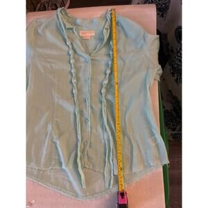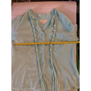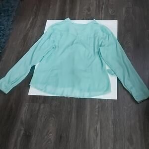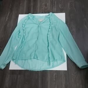 Style: Button down, raw Hem sheer blouse with decorative neck
