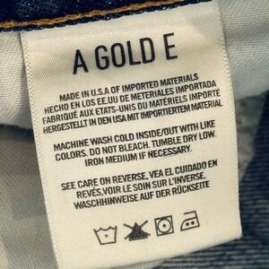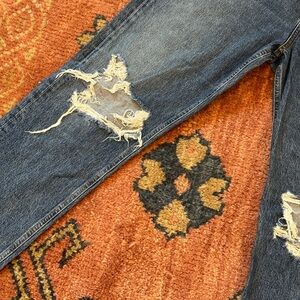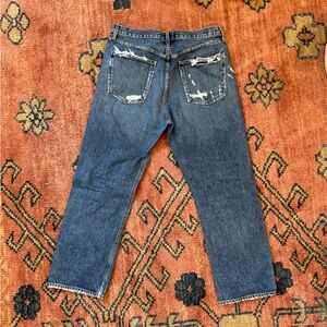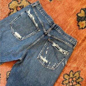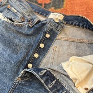Agolde 90s style jeans with a loose fit straight leg cut. Holes around knees area and distressing at pockets and upper right thigh (see pics). Button fly. High waist. Hits right around ankle. Preowned in Excellent Condition!