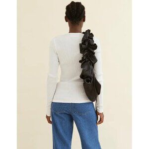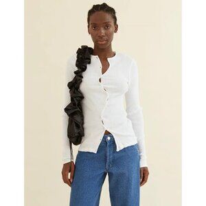 Elegant white cardigan featuring a striking black ruffle detail. Perfect for adding a touch of sophistication to any outfit.