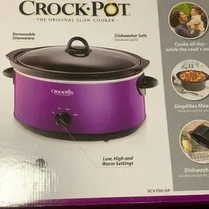 Enhance your kitchen with the stylish Crock-Pot Purple Slow Cooker. Enjoy convenient cooking with removable stoneware and dishwasher-safe parts. Perfect for all-day cooking with low, high, and warm settings. 7 quart. New.