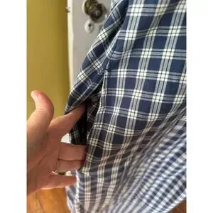 Button front, short sleeves, sash that ties in back (doesn't go all the way around the front; attached at sides), rounded neckline, unlined, side pockets. Very modest. Lovely blue plaid 100% cotton fabric.