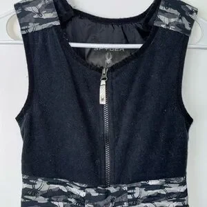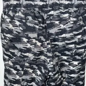 Camouflage spider print. Fleece upper with Velcro tab shoulders. Adjustable waist. Small to tall seams have been let out