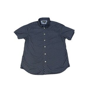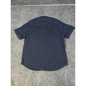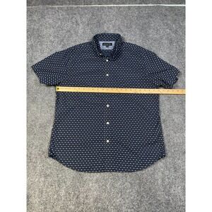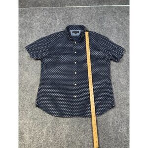 The Banana Republic Stretch Soft Wash Button Up Shirt is a stylish and versatile addition to any man's wardrobe. This short sleeve shirt in a size large features a geometric pattern in blue, perfect for a casual yet put-together look. The button-down collar adds a touch of sophistication, while the stretch fabric ensures a comfortable and flattering fit. Ideal for a preppy or business-casual style, this shirt is a timeless classic from the reputable Banana Republic brand.