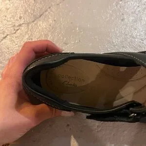 Clark’s Roseville Jane slip on shoes. Velcro closure. Size 8. Black leather and suede look. Rubber sole. New, never worn.