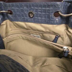 Features: Silver-tone studs, crocodile-textured trim, inner zip pocket, magnetic snap closure