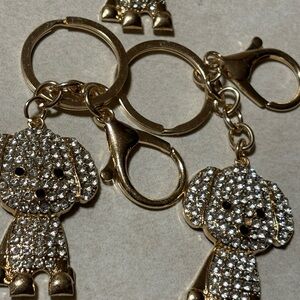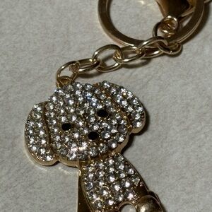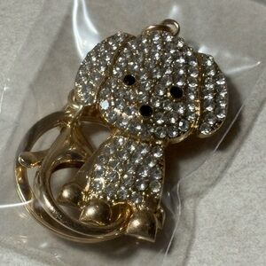 Charming dog-shaped keychain with gold and clear crystals. Perfect for adding sparkle to your keys.