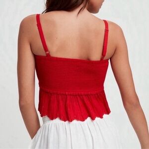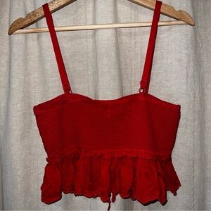 Stylish red ruched top with adjustable straps. Perfect for any occasion.