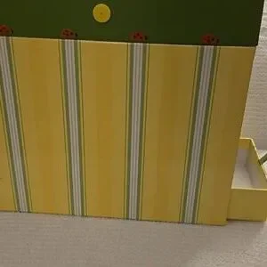 Decorative greeting card organizer featuring green and yellow stripes with charming ladybug accents.