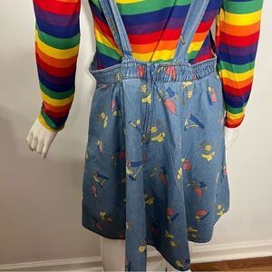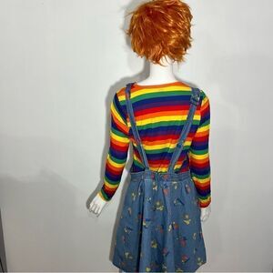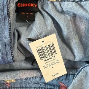 Overall blue chambry jumper dress with the Chucky slogan "Good Guys". Costume comes with dress, striped long sleeve t-shirt, plastic kn*fe, and wig.