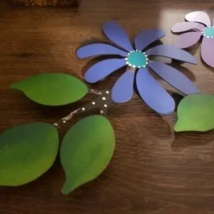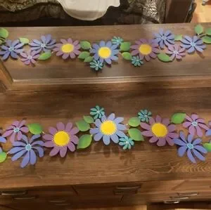 This was a hard one to photograph. The mirror behind actually helped to get the whole piece in the shot. Hand cut and painted. Teal, blue, yellow, purple. Absolutely bright and beautiful. The paint is almost translucent in places and you can see the black of the primer peeking through. Gives it a shabby chic or primitive look. There are a couple small scratches that may cause someone to want to repaint it or touch up the paint in those spots. There are others like this in my closet.