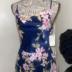 Be the best-dressed guest in the Lulus Love of Romance Navy Floral Print Satin Cowl Neck Maxi Dress! Elegant brushed satin shapes this dress with a cowl neckline and fitted bodice that are supported by adjustable spaghetti straps that crisscross across the open back. A high waist tops an overlapping maxi skirt that creates a faux-wrap effect. Hidden back zipper/clasp.