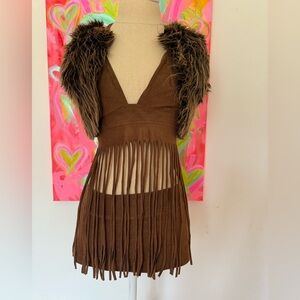Stylish brown halter top with fringe detailing, mini skirt and faux fur vest. Perfect for a boho look! NEVER WORN & perfect condition. Sold as a set