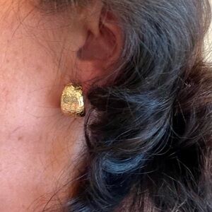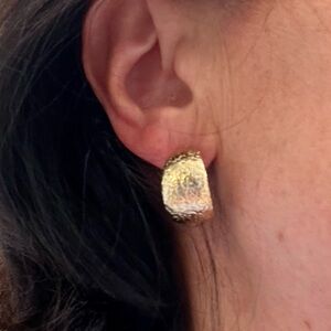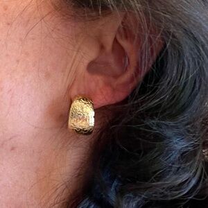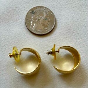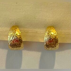 Add a touch of elegance with these gold tone tapered hoops, adorned with intricate design textured surface. Hoops measure 1 cm wide and 2 cm diameter, and are for pierced ears, with stainless steel posts. Earrings are in excellent condition, like new.