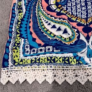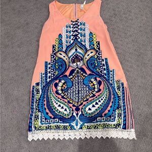 PINK OWL Sleeveless Peach/Navy Geo Shift Dress w/ Emb details Sz M EUC