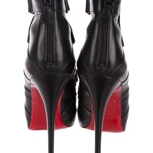 Elevate your style with these Christian Louboutin black leather ankle boots, a quintessential addition to any fashion-forward wardrobe. These ultra-stylish booties feature a commanding 4-inch stiletto heel and a sophisticated design that combines edgy with elegant. Crafted from premium black leather, these booties showcase a distinctive criss-cross pattern of leather straps adorned with silver links, running from the toe to the top. This chic detailing creates a striking contrast against the signature glossy red soles that Louboutin is renowned for, making them a statement piece for any outfit.