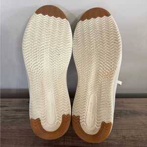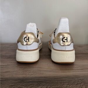 Shoes are great! Just a little big for me. Elegant sneakers with a cream base and gold highlights. Perfect for casual wear.
