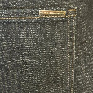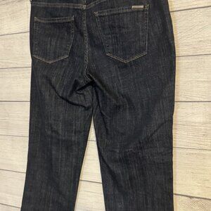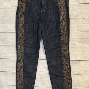 Women’s White House Black Market jeans in dark rinse blue. Mid-rise girlfriend fit with cuffed ankles. Features beautiful gold thread embroidery down the front of both legs and one pocket. Everyday Soft denim blend with stretch.