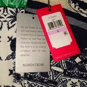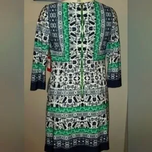 Elegant Vince Camuto dress from Nordstrom, new with tags showing price of $128.00. Scrollwork and geometric patterns include fresh green, white and black designs. This dress is really and appropriate for year-round wear. 3/4 length sleeves, and full lining in solid green.