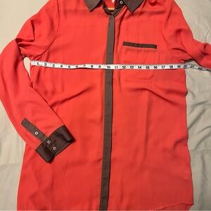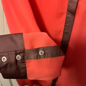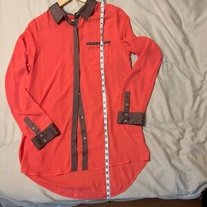 Beautiful coral and champagne trim flowy blouse. This is beautiful and can be worn many ways. Perfect fall wardrobe update piece.