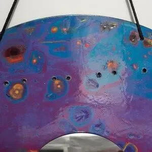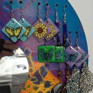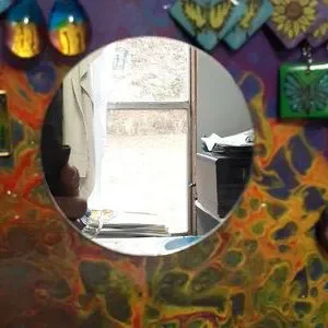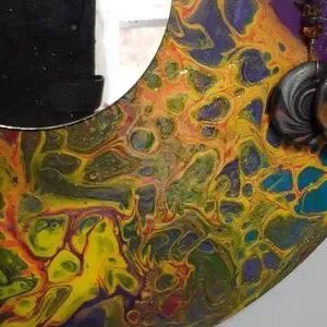 drilled to hold 14 pairs of earrings plus it has a 4" mirror in the middle to help you with putting your earrings on, even your makeup. The painting is vibrant with cerulean blue, purple, yellow, orange, magenta and green .This unique wall art is also very useful to display your jewelry in a bohemian retro hippie fashion. One of a kind unique wall art will also make a great gift for someone with lots of jewelry or someone with a few.