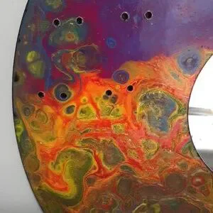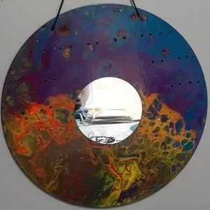 This 12" vinyl record is hand painted using a fluid art technique with acrylic paint. It hangs from a black satin cord to make a unique wall hanging of your jewelry. Holes are