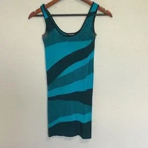 Chic mini dress with bold teal and black pattern. Sleeveless design. Perfect for a night out. Has some snags wore one time