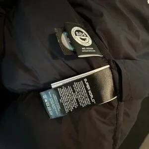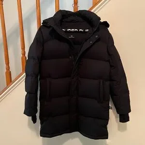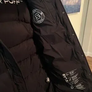Stylish black puffer jacket by Aritzia. Features a cozy hood and front pockets. Perfect for cold weather.