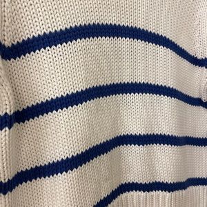 Stylish cowl neck sweater. Features bold blue stripes. Soft and comfortable knit.