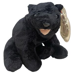 Ty Beanie Baby named Cinders the Black Bear, which was part of the Ty Beanie Babies collection and was first introduced on April 30, 2000. Cinders is a plush stuffed animal with a black exterior, shiny black button eyes, and a light brown mouth. The Beanie Baby is in a seated position and has its original tags, indicating it is likely in mint condition. The tags include a heart-shaped tag and a tush tag. Cinders' poem reads, "I sleep in caves and in the snow. A mountain life is all I know. In the Spring I wake again. And look around for my best friend!". The Beanie Baby is approximately 5-6 inches in size.