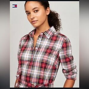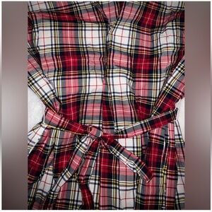 Chic plaid dress with a tie waist. Features long sleeves and a classic collar. Perfect for versatile styling.