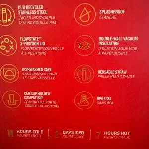 Recycled stainless steel, splash proof, flowstate 3-position lid, vacuum insulation, fits car holder!