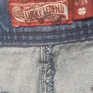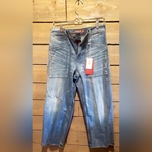 Stylish light blue jeans with a cropped design. Features large front pockets and a button closure. Perfect for everyday wear.