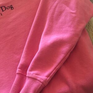 Vibrant pink sweatshirt with iconic black dog logo. Comfortable and stylish.