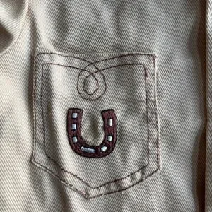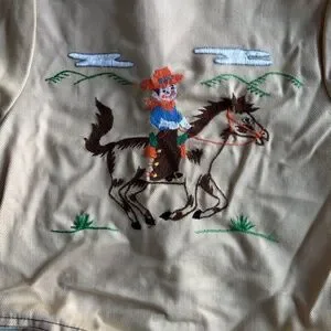 sweet little embroidered cowboy themed jacket. Tan with horseshoes on the front and a little cowboy riding a horse on the back