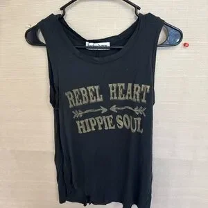 Show off your bohemian style with the Rebel Heart Hippie Soul muscle tee. This black top is perfect for laid-back days and adds a touch of free-spirited flair to your wardrobe.