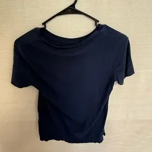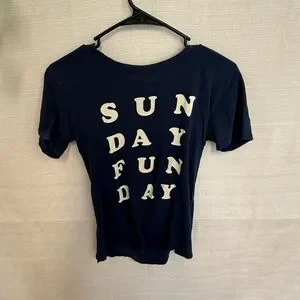 Navy blue top with 'Sunday Funday' text. Short sleeves. Casual style.