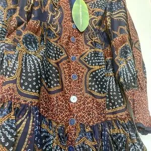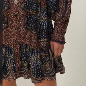 Chic long sleeve dress with vibrant paisley pattern. Features deep V-neck and ruffled hem. Perfect for stylish outings.