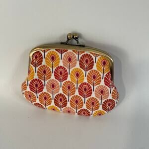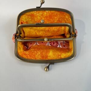 Charming vintage twin metal frame change purse made in London featuring a dual clasp closure. Pretty floral pattern in various shades of orange decorates the exterior. Interior lining is a contrasting deep yellow fabric. Compact size measuring approximately 5.5 by 4.5 inches. Perfect for vintage purse collectors or those looking for a unique accessory.