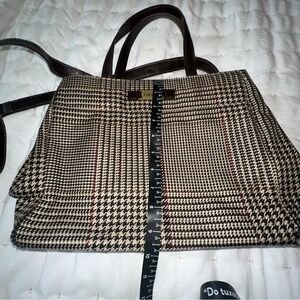 Stylish houndstooth pattern. Features dual handles and shoulder strap. Elegant gold-tone logo detail.