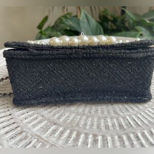 This stunning black clutch features exquisite pearl embellishments, perfect for adding a touch of elegance to any outfit. Ideal for evening events or special occasions. Pre-owned & in excellent condition.