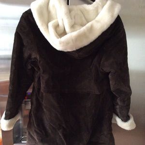 This cozy coat will keep you snug and warm. It is in excellent condition as it has been loved and well cared for. It is hooded, has toggles inside to cinch waist (if desired), and has multiple pockets.