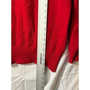 This Victoria Jones women's pullover sweater in size L features a classic cable-knit design in a vibrant red color. Made from 100% cotton, it includes shoulder pads and a button-up collar for added style. This vintage piece is crafted in Indonesia and requires hand wash care. The sweater is pre-owned.