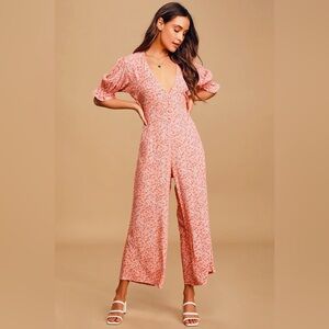 Chic pink floral jumpsuit with a deep V-neck. Features puff sleeves and a relaxed fit. Ideal for stylish outings.