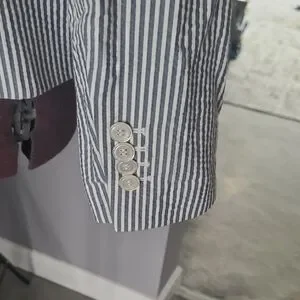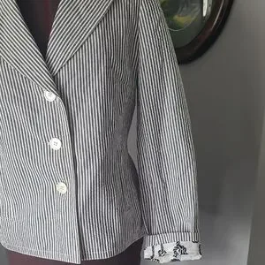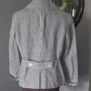 Elevate your style with this chic striped women's jacket. Perfect for any occasion, this blue and white piece adds a touch of elegance to your wardrobe.