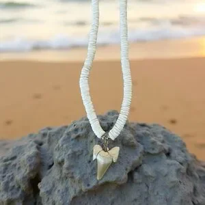 Elegant white shell necklace featuring a unique shark tooth pendant. Perfect for adding a touch of coastal charm to any outfit.