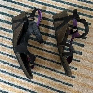 Stylish and comfortable Teva women's black leather wedge sandals. Size 8. Velcro ankle closure; cork wedge with leather insole. Slight wear on heels. Non-smoking home.