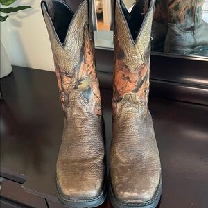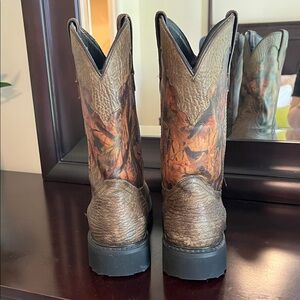 Stylish cowboy boots by J.B. Dillon. Features a rugged brown leather with tan accents. Perfect for any western look.