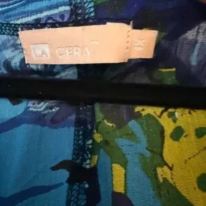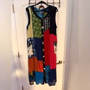 Vibrant sleeveless dress with a patchwork design. Features a mix of red, blue, green, and black panels. Button-down front adds a stylish touch.